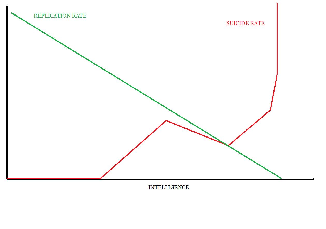 Possible correlation of intelligence to replication and suicide rates (not to scale)