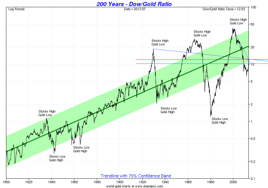 I would suspect that, if this ratio were to decline, it will be as a result of gold prices moving higher and stock prices moving lower, or gold prices staying about steady to slightly lower and stock prices moving a lot lower. It might be reasonable to expect this ratio to see a value of less than 2 from a peak in this area near 12.