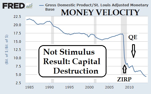 The result has been a systematic assault on capital. The USEconomy has entered a feedback loop of capital destruction, job cuts, and reduced activity. It cannot be stopped. The results of much lower Money Velocity stands as screaming evidence of failure in monetary policy. The moribund activity means capital is being ruined, not functioning, not producing the wanted output. The slower turnover in the USEconomy is not from hoarding of cash. The participants are suffering a shortage of money, often struggling to survive. Putting money in mattresses is an absurd concept when struggling to pay the rent and buy the food and pay the utilities. jw