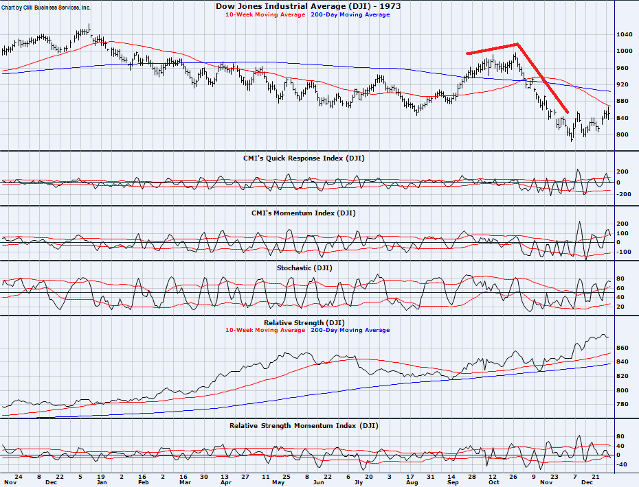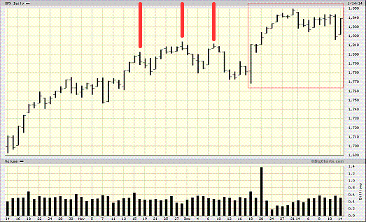 The last peak in the 1937 and 1973 stock markets before a collapse ensued happened with an initial peak, followed by a flat market, then a final peak 2 weeks later that was a bit higher than the initial peak. The initial peak in the current market was December 31 and today is 2 weeks later. So timewise we are there. But as of yet the market has not made that final poke up above the initial peak that it did in 1937 and 1973. Will it do it this late in the game if this is really where things are? I just don't know. One guess is that since the market cracked hard yesterday and closed near the low, the answer is no.