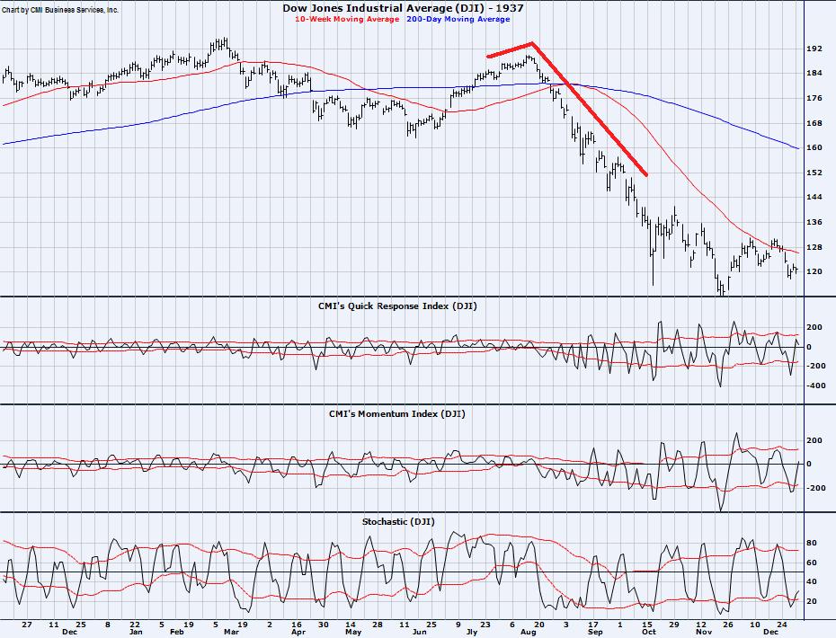 My general sense is that we are facing something like what I have marked as the heavy red lines on these 1937 and 1973 charts. However, this has been taken much further and I question whether the initial descent will happen as a day after day affair or go "all at once". I suspect the latter, that we will blink and weeks worth of initial 1937 and 1973 declines will be gone in an instant in time. Another question would be whether it makes the last gasp at the end that it did in 1937 and 1973. That would perhaps imply a last gasp this week and I just don't know. The answer could well be yes; there is clear precedent for it in 1973 just from the pattern but that may be too simplistic. And there had been no crack at that time similar to that which occurred yesterday.aedens wrote:As the arc of instability suggest from reports we are in a compression market or to say different stroke of affairs.