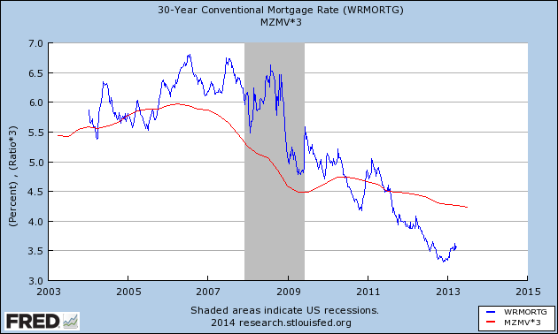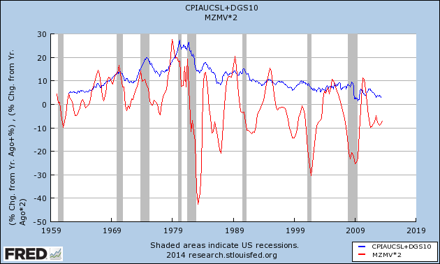 This graph is adding 10 year bond interest rate and inflation rate and comparing that to the velocity of money: