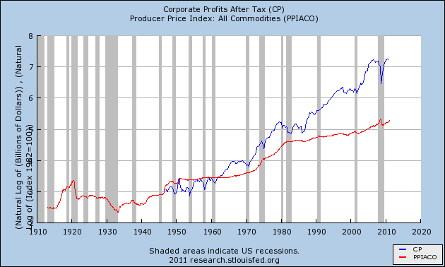 This next one shows corporate profits compared to PPI. When PPI was going up fast in the 70s the corporate profits were not going up any faster than in the 60s or 80s. So it seems inflation was not increasing profits.