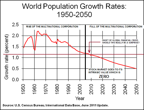 Can a stock market, which is dependent on economic growth, rise in the face of zero population growth? I don't think it can even exist, much less rise. World stock markets in fact barely existed before world population began to rise at rates greater than 1% after World War 2.