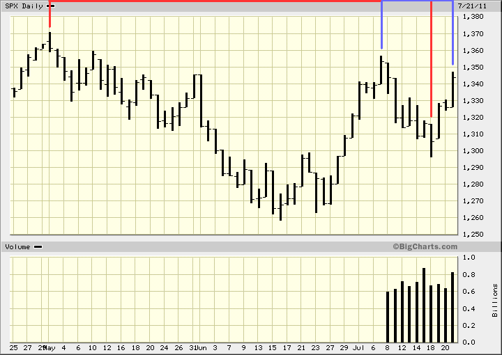 2011: New Moon May 2, Full Moon July 14 (between the double top in July)