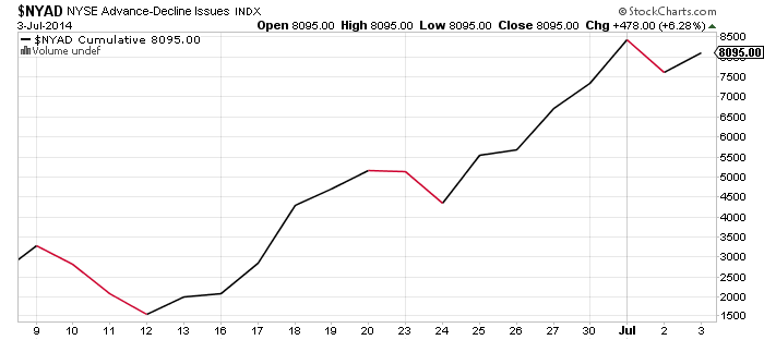 At the prior 2 short term highs (June 9 and 23) the AD Line topped with the market but last week the AD Line turned over on Tuesday ahead of the market averages. The cumulative AD Line is the cumulative sum of daily NYSE advancers minus decliners.