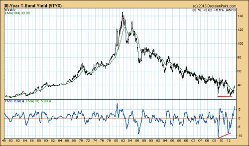 I suspect that it's more a fear of the start of tapering, rather than a fearHiggenbotham wrote:Thanks for continuing to show this chart as most don't pay much attention to the 5 year. It's those out of the way observations that sometimes are the most important. To me, this means it is beginning to be recognized that the US financial system is not going to last 5 years. People are scurrying away from the 5 year as if it's junk debt, which it now is. Also, with the Fed not bothering to prop up the 5 year it is becoming quite telling as to what would be happening without Bernanke counterfeiting money to buy the 30 year and what is going to happen soon anyway.vincecate wrote:The 5 year bond was at 0.5% and is now coming up on 2%.