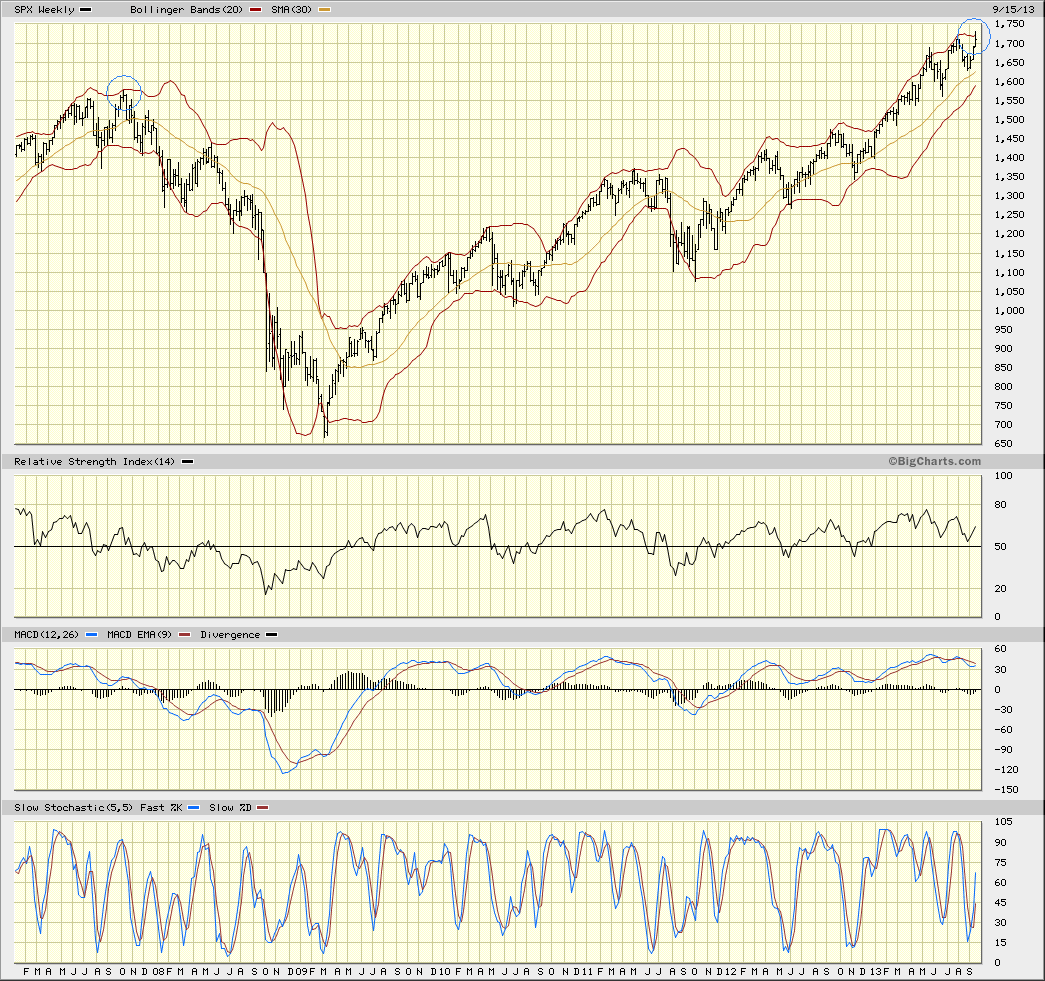 Perhaps another technical point in favor of this being a long term high is the flattening of the upper red Bollinger Band on the chart below, followed by the probe up into the band and reversal away from it on the weekly close as also occurred at the 2007 high (blue circled areas).